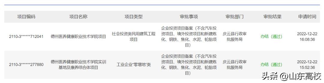 2022年12月22日,德州医养健康职业技术学院项目通过企业投资项目备案审批。