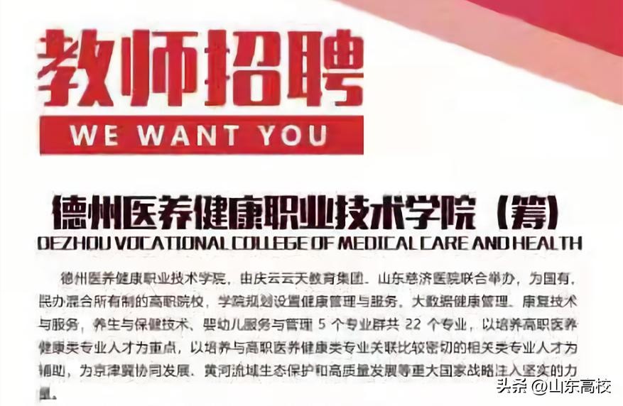 2021年10月28日,滨州学院体育学院官网发布《德州医养健康职业技术学院(筹)招聘》。根据介绍,德州医养健康职业技术学院由庆云云天教育集团、山东慈济医院联合举办,为国有民办混合所有制的高职院校,学院规划设置健康管理与服务、大数据健康管理、康复技术与服务、养生与保健技术、婴幼儿服务与管理5个专业群共22个专业。