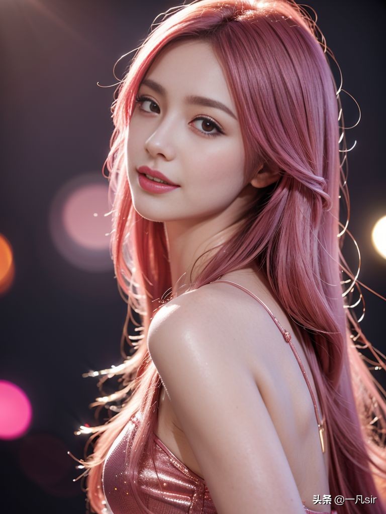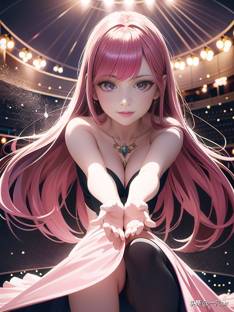 萨勒芬妮, 迷人的旋律, 有着飘逸的粉色长发和迷人的微笑, 在耀眼的舞台上以她优雅的动作迷住了观众, 演唱会灯光, 迷人的服装, 优雅诱人(最好的质量, 高, 超详细:1.2), 肖像, 演唱会, 舞台表演, 鲜艳的颜色, 镜头闪光, 专业, bokeh, 工作室灯光, 空灵的氛围, (最好的质量, 照片逼真, 超详细, 8k:1.2), 完美的手,