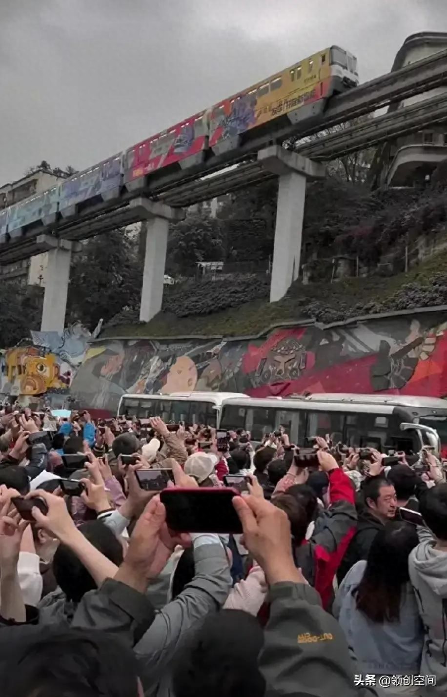 昨天一家人本来想到解放碑去,由于考虑到五一期间外地游客很多,就到人少的弹子石,回家途中车经过李子坝轻轨站时人山人海,大家都举着手机拍轻轨穿楼。本来轻轨穿楼是一个无櫴的设计,当时由于地皮已经卖给开发商了,开发商不愿意放弃,轻轨又要从这儿经过,最后设计师只好设计轻轨从楼中穿过。当地人觉得没什么,但被外地人硬硬生生发掘出来成一个旅游景点、一个网红打卡点。重庆市政府考虑到公路边不安全,还给游客修了一个观景台。这就是重庆,没有第二个城市了吧!