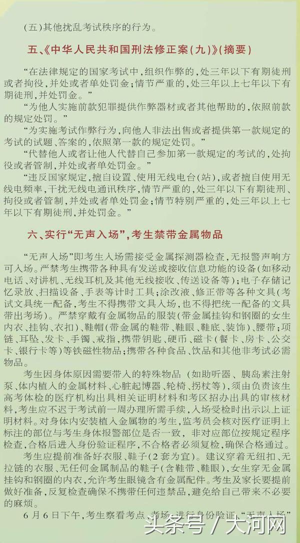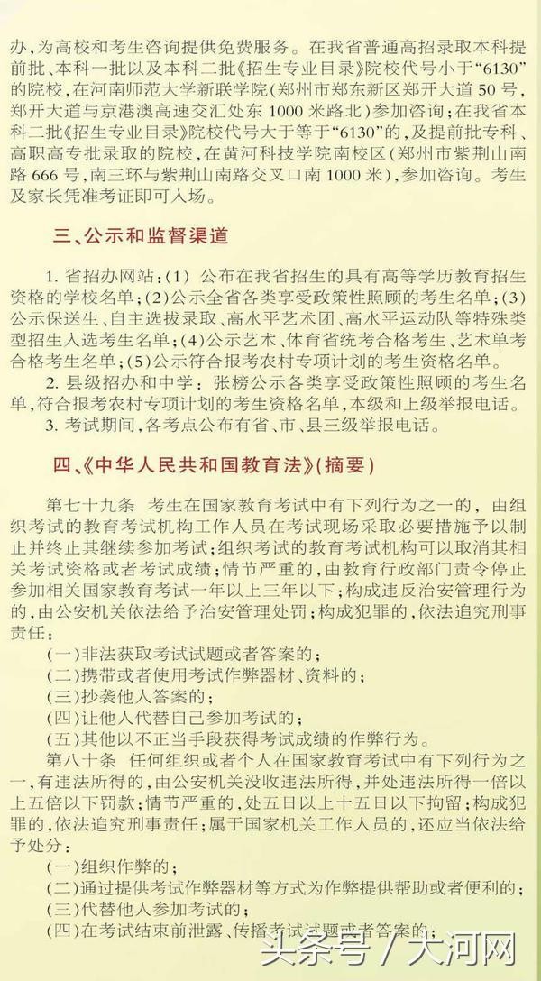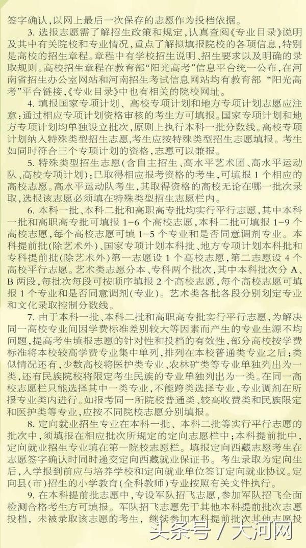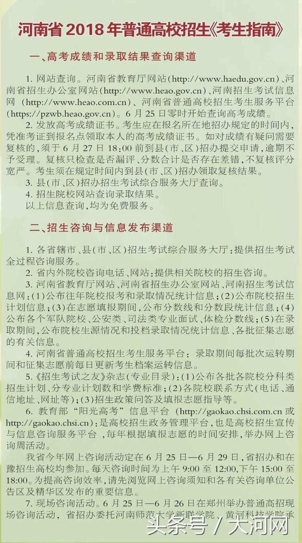大河网讯(记者 张楠)6月6日下午,考生察看考点、考场;6月25日零时查询高考成绩;本科一批、本科二批、高职高专批均实行平行志愿……5月31日,河南省2018年普通高校招生《考生指南》公布,详解今年高考、高招录取过程中考生和家长关心的问题。