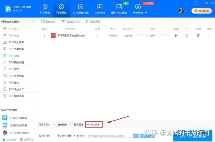 PDF操作→PDF压缩→上传文件(选好压缩优先级)→开始转换