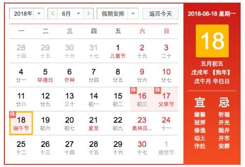 6月18日(星期一,农历端午节当日)为国家法定节假日。