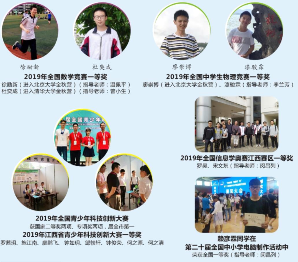 学校组建专业奥赛教练,选拔尖优学生进行个性化辅导。近年来,我校学生获得全国学科奥赛金牌、银牌、铜牌数量均居赣州市首位,各类奥赛刷新了赣南学科奥赛历史。其中胡辰同学获中国奥林匹克数学竞赛金牌,刷新了赣州市历史;曾令萱、崔缨子夺得全国青少年科技创新大赛金牌,为全市最好成绩;赖金霖同学获得全国信息学奥赛金牌,亚太地区信息学奥赛APIO金牌,填补了该奖项江西省历史空白;宋沛荻两度获得全国信息学奥林匹克竞赛银奖。