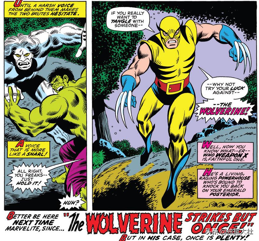 金刚狼的第一次出场就是在浩克的漫画中,他卷入了浩克和温迪戈的争斗。