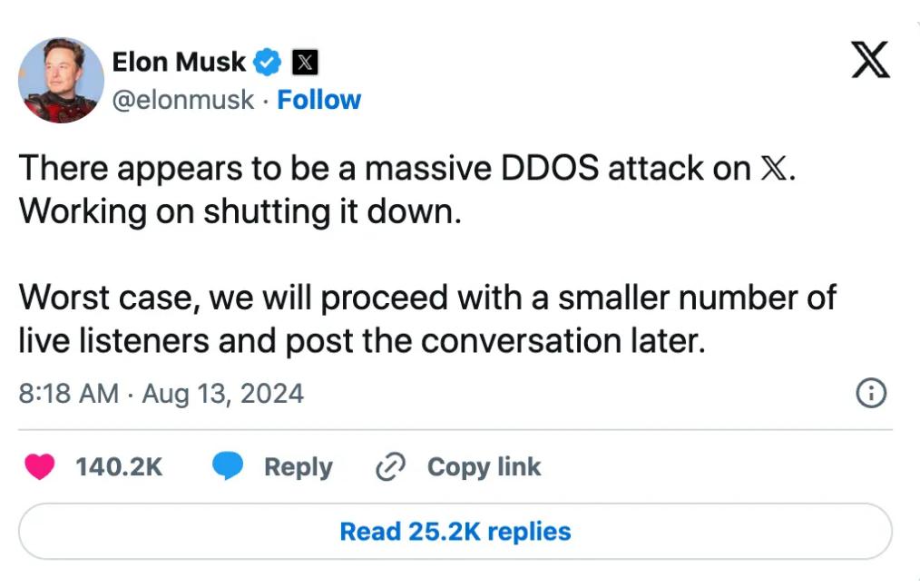 马斯克表示,X 似乎遭到了大规模的 DDOS 网络攻击,我们正在努力阻止它。最坏的情况下,我们将在只有少量现场听众的情况下继续与特朗普的访谈,并在稍后发布对话内容。