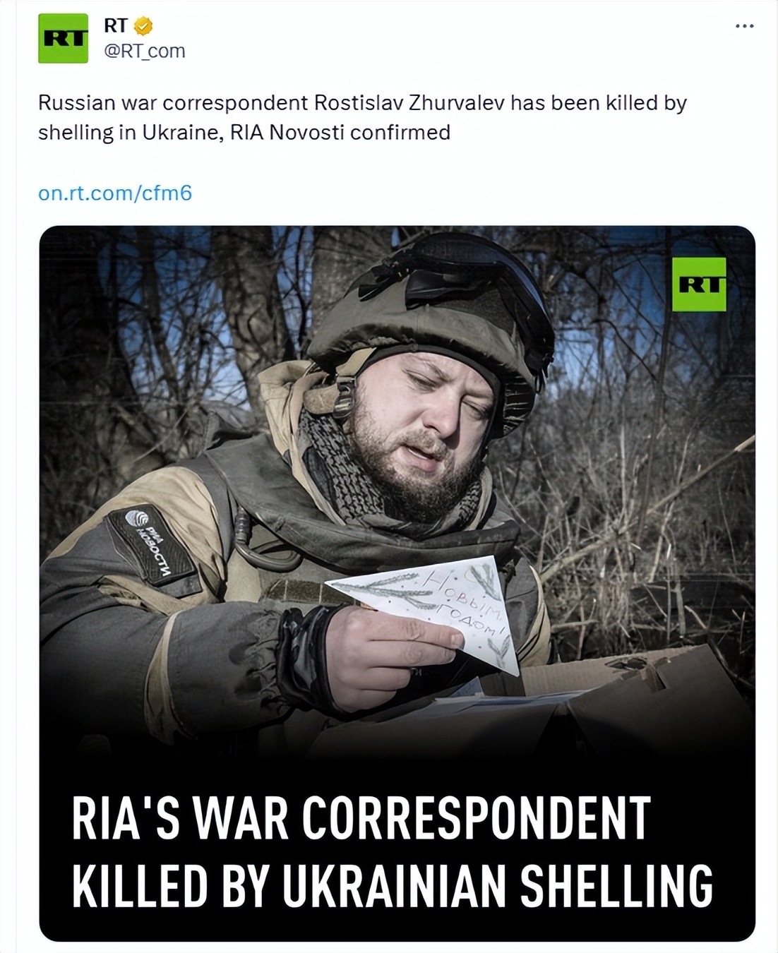 “今日俄罗斯”(RT)称,俄战地记者在乌克兰炮击中丧生 图自RT报道截图