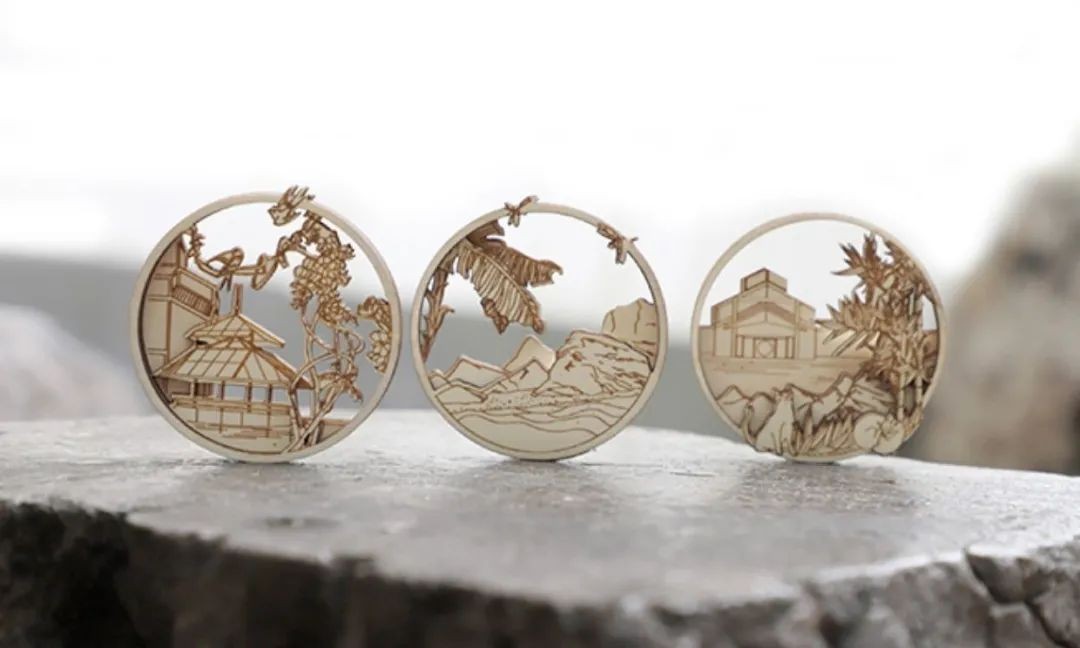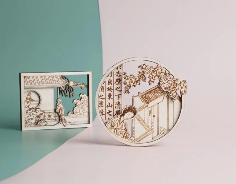 此款木刻冰箱贴的创意来源就来自苏州博物馆自身的优美景色,苏州博物馆的文创团队以其为背景,并且将自身最具代表性的三种植物,翠竹、芭蕉和藤枝作为主题,用杨木的材质制作成冰箱贴,使自身的建筑形象巧妙的融入到了产品中。