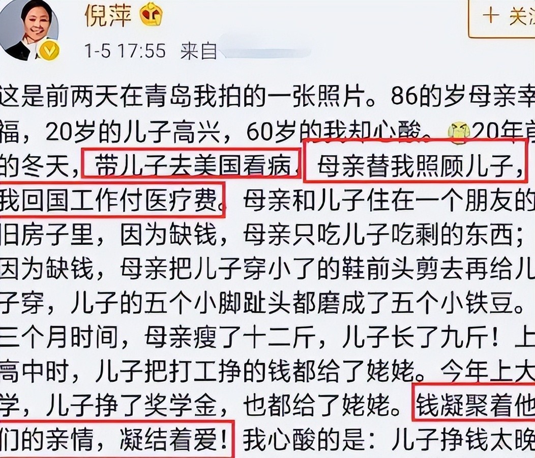 他在离婚时把所有的财产都留给了倪萍,自己则在外面工作,会定期寄钱给儿子,偶尔也会打电话问候。