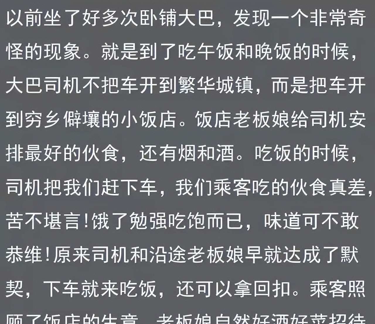 除了拥挤、嘈杂的问题,九十年代的长途大巴还存在着卫生和饮食状况恶劣的难题。有网友直言当年的饭菜"让人难以下咽",可见那时的大巴旅途中,吃的就是大家公认的难以下咽的伙食。