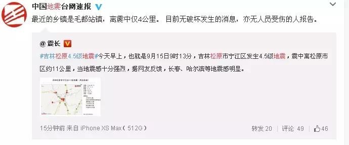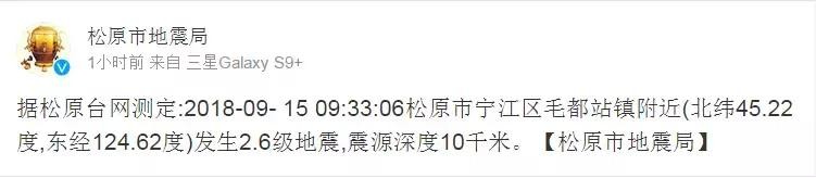 据吉林省地震台网测定:2018年9月15日9时13分13秒,松原市宁江区(北纬45.19度,东经124.71度)发生4.5级地震,震源深度10千米,震中距松原市宁江区城区约10公里,距松原城区11公里,距长春市158公里。长春、白城、四平等地有震感。