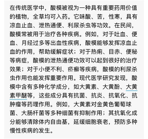 酸模是一种优秀的园林绿化植物。它的叶子翠绿,花朵艳丽,适应性强,能在各种环境中生长。在公园、庭院、道路绿化等方面都能发挥其独特的魅力,为环境增添一抹亮色。同时,酸模还能吸收空气中的有害物质并净化空气,有助于为人们创造一个健康舒适的生活环境。