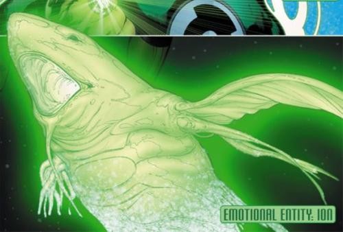绿灯的灯兽叫离子鲨,长得像绿色的鲨鱼,它是最惨的,在跑路的时候被咬掉一半,逃进实体宇宙的时候已经是奄奄一息了,全靠意志坚强才活了下来,所以就是产生了意志和勇气的情绪。
