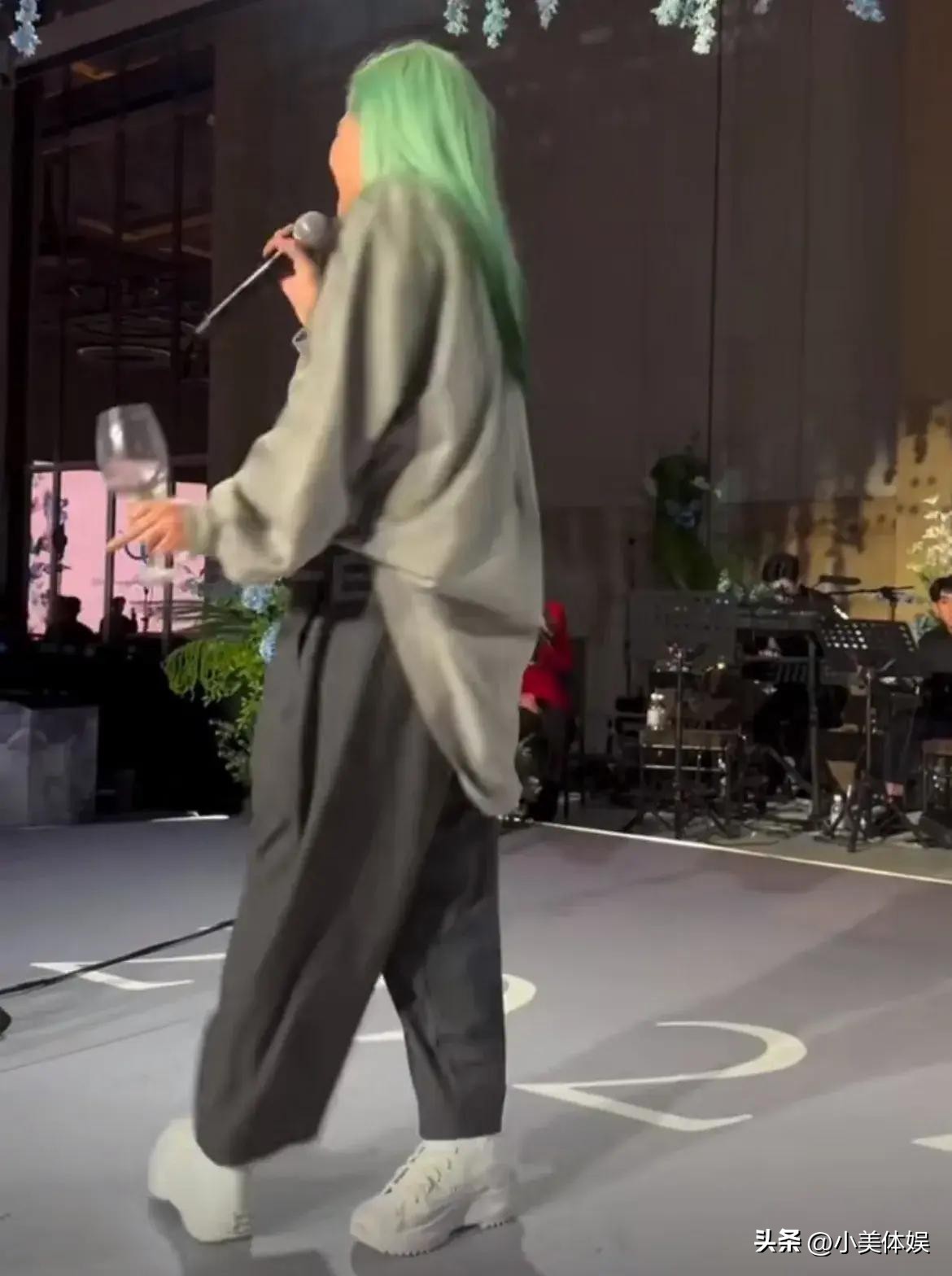 她一头绿发,穿着超大衬衫搭配宽松裤子,整个人胖了一大圈,让人差点认不出。