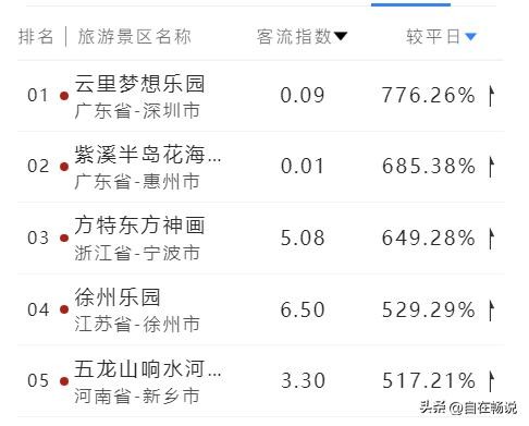 深圳市运力梦想乐园,客流增幅最大,达到平时的7.7倍,而惠州市的紫溪半岛花海世界和宁波市的方特东方神话增幅都超过6倍。