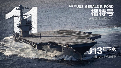 2013年下水,排水量100000吨,全长337米,舷号CVN-78,最高航速30节以上,采用电磁弹射系统