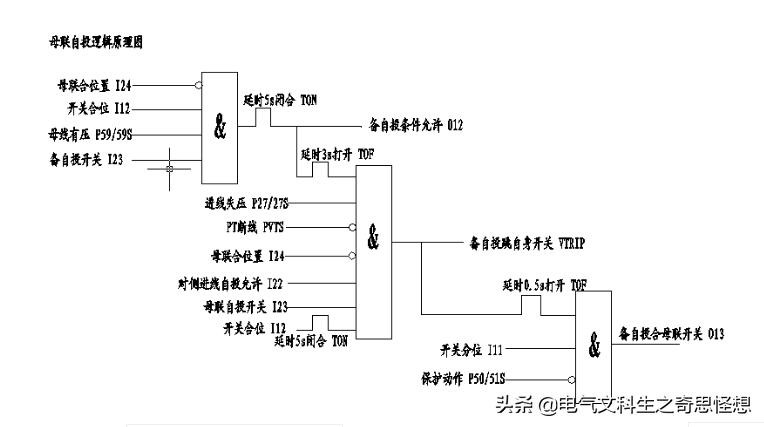 下面这个是备自投的逻辑图,看起来就稍微有点繁琐了,其实跟我上面讲的是一样的。