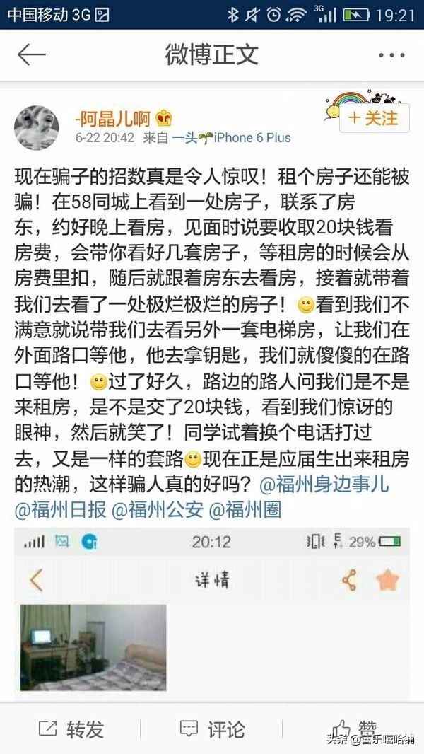 据福州的网友爆料称自己在58同城租房时,看好一处房子,联系房东看房,见面后房东要事先收取20元的看房费,随后看了一处环境极差的房子,看到自己不满意后就去看另一处房源,让我们在外边等他,他去拿钥匙,最后这位房东就消失了,而我们还在傻傻的等着。