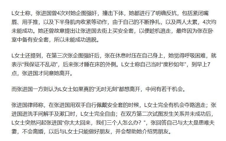 之后就把L女士压在床上,张进国把脸贴在了L女士的脸上。这是L女士的说辞。