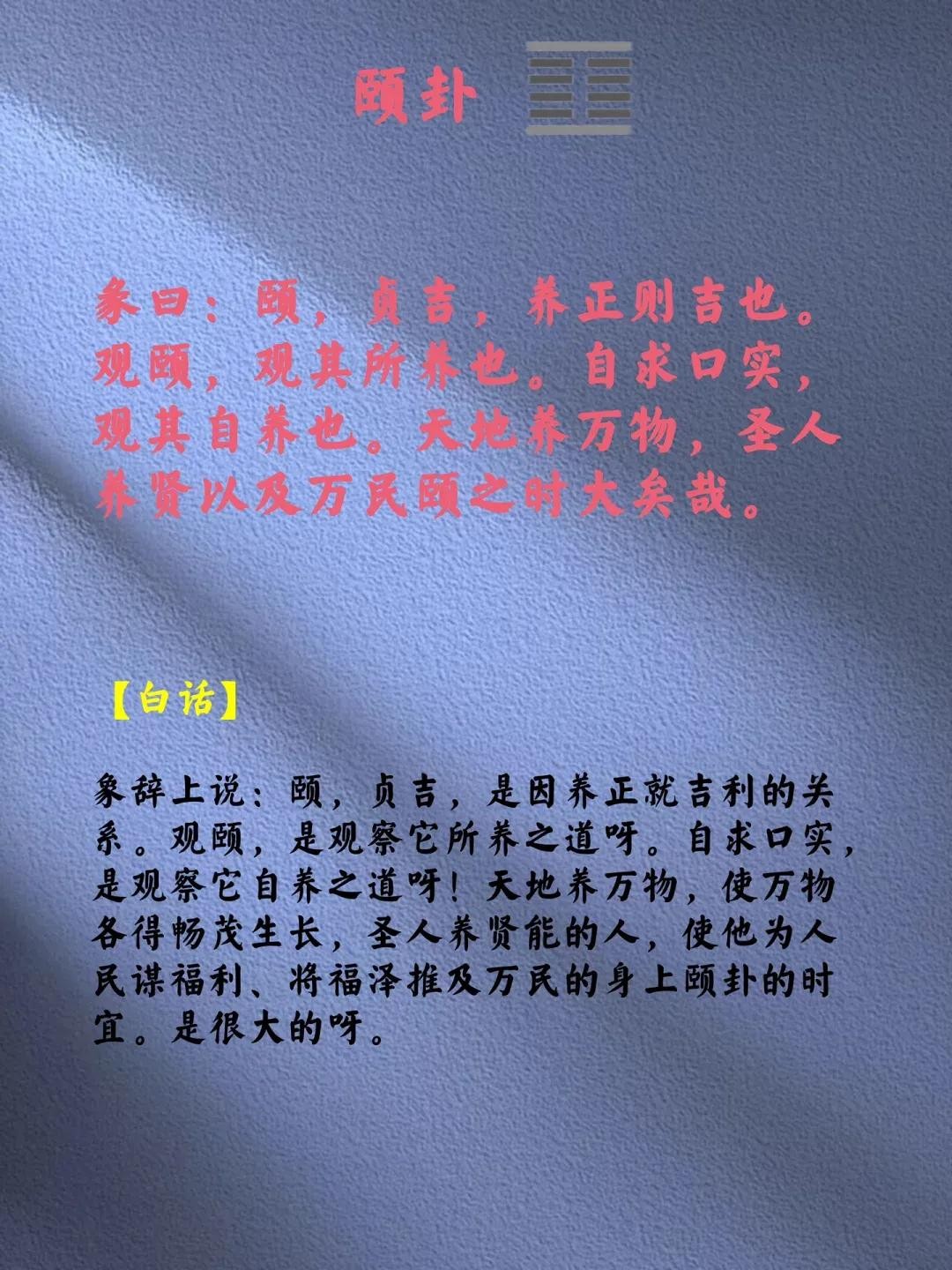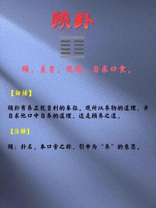 颐卦的卦辞是“颐:贞吉。观颐,自求口实。”意思是说,走正道是吉利的,观察养生之道,自己主动去寻找生活所需的资源。听起来有点抽象?其实就是告诉我们:别光羡慕别人过得好,要主动去争取自己想要的生活。