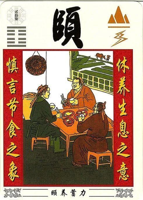 首先,颐卦的卦象是“山雷颐”,上面是山(艮),下面是雷(震)。山代表着稳重和宁静,而雷则象征着活力和变化。简单来说,山雷颐就像一杯混合了稳重与激情的养生饮品,喝下去后,让你既能安静思考,又能激发活力。