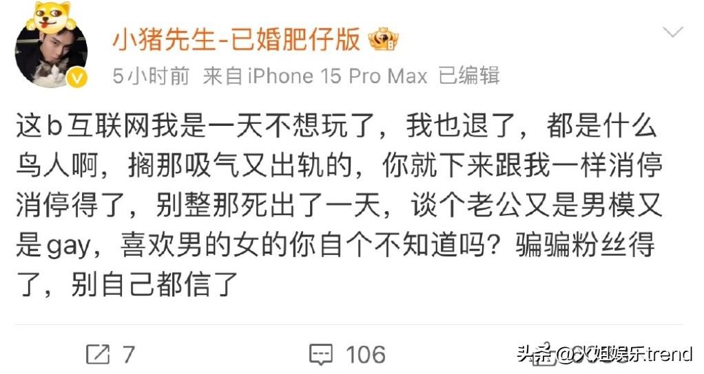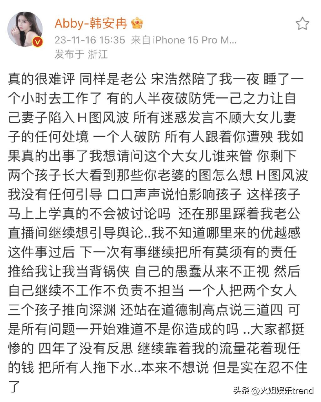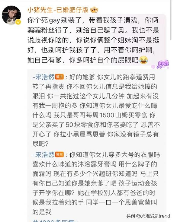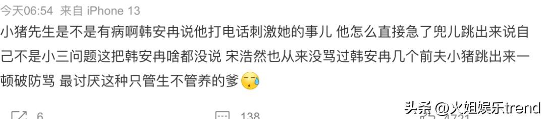 怼完韩安冉又抓着韩安冉现任老公宋浩然一顿喷,指责对方带着自己的孩子演戏,还攻击对方是gay。