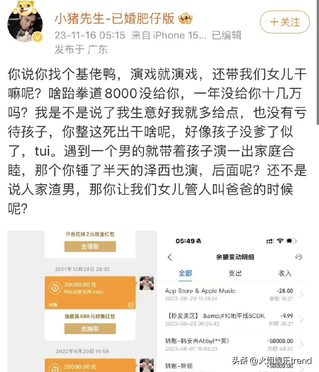 小猪反击晒出了给韩安冉转账的记录,可惜大部分网友不买账,觉得小猪先生有点过分,宋浩然把他孩子当自己亲女儿照顾,他不感谢还人身攻击。