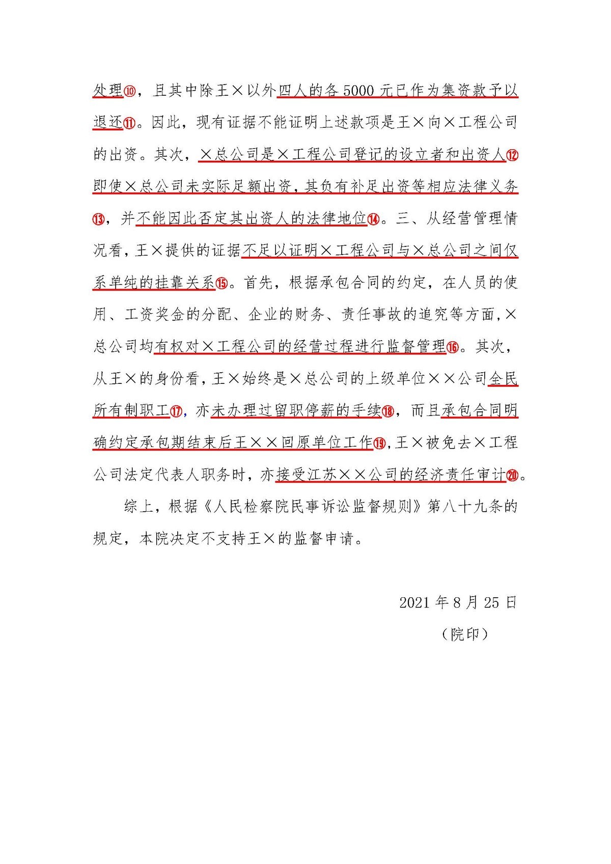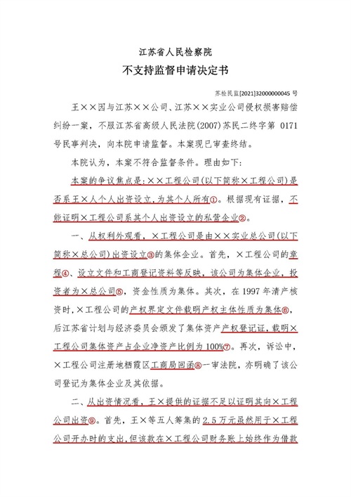 另一公文是江苏省检2021年的一份《不支持监督申请决定书》。起因1993年南京王某(乙方)与五位工友响应号召集资兴办了一集体企业,与江苏某总公司(甲方)签订了自负盈亏的承包合同。乙方是法定代表人,靠该集资款领取证照和市场揽活自主经营。2005年甲方突然收缴公章强占了该企业,乙方求判甲方违约、违法。二审及申请再审后申请监督,2021年收到该决定书。乙方认为该公文严重违法: 一、众所周知,我国集体企业的工商注册没有投资人登记。国家规定实际投入企业启动的钱和物为实收资本,由国家清产核资后颁发产权证为法律凭证。该企业产权证载明“伍拾万元资本额归本企业劳动者集体所有”,是国家规定集体企业三种投资形式的第一种,投资人为“本企业劳动者”。该证上无甲方名字和出资额,其无投资人身份,该公文称甲方是“登记的投资人”纯属谎言。 二、称同明确约定承包期满后王某回原单位工作”是篡改变造的虚假“约定”,