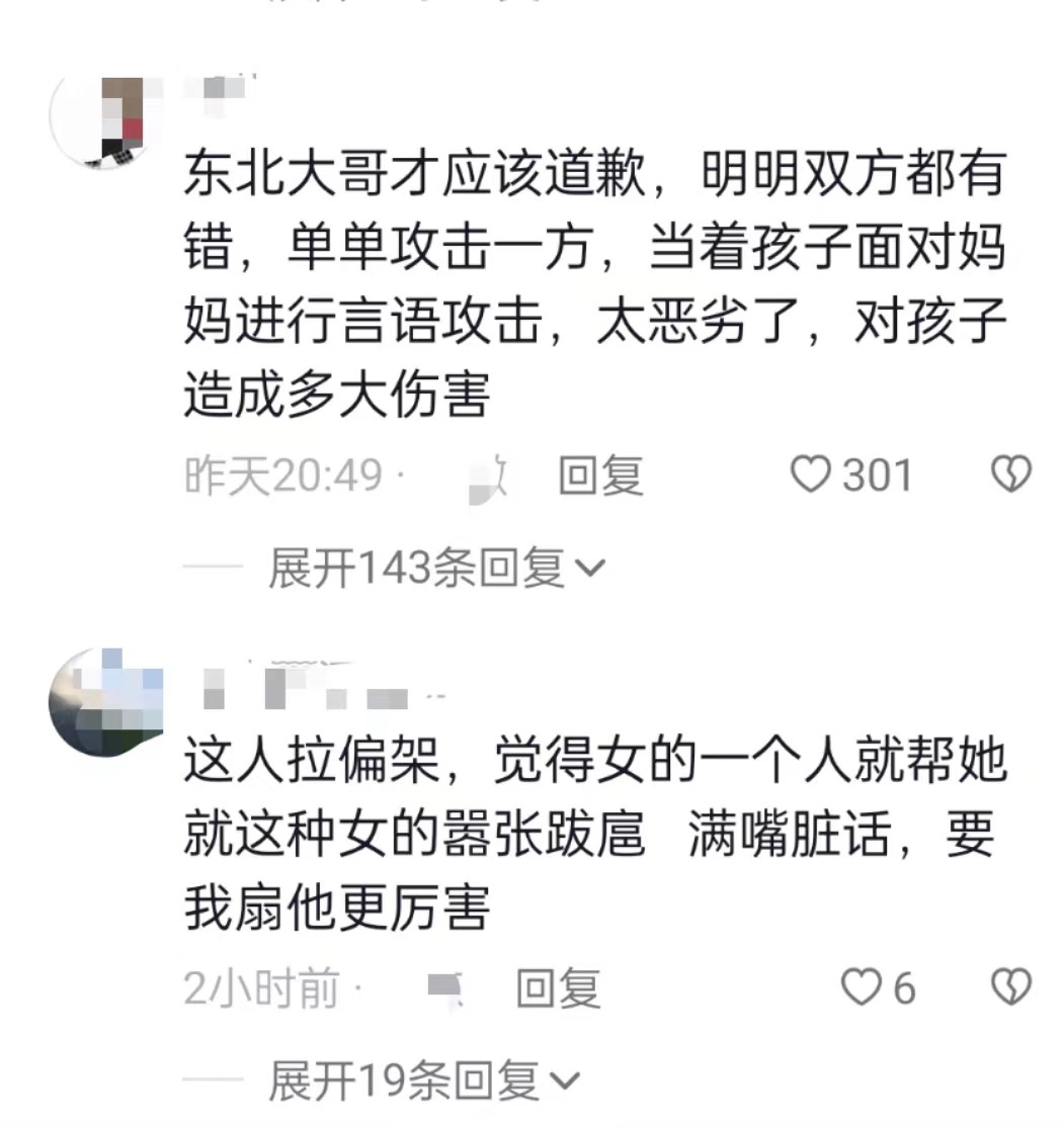 在劝解的过程中,东北大哥说是孩子先吵到人家,人家才吼的,对孩子妈妈批评教育,网友们纷纷认为东北大哥把事情前后说的很清楚,东北大哥做的对。