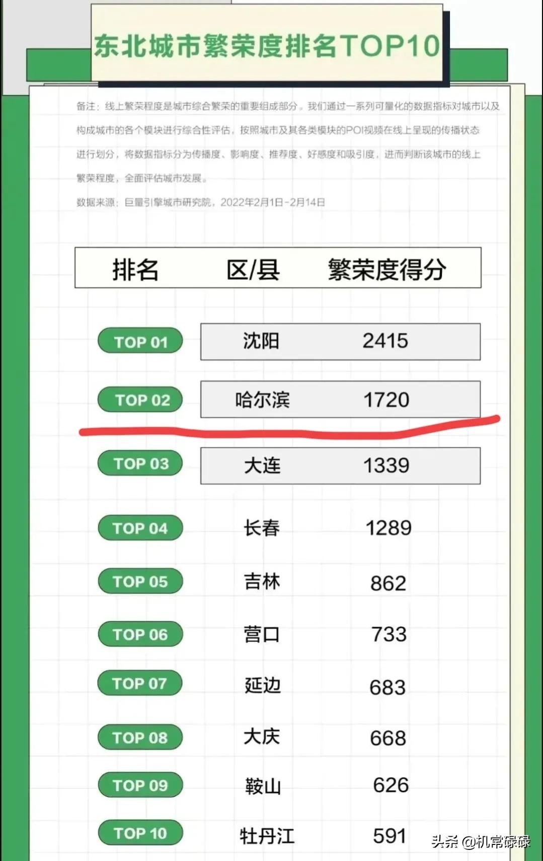 巨量引擎城市研究院发布了东北城市繁荣度排名,包括传播度、影响度、好感度、推荐度和吸引度等几个方面,这个名单与我心里的想法相符,也与我对东北地区各大城市的看法基本一致,有种他乡遇故知的感觉,因此,有点迫不及待的想分享给大家。