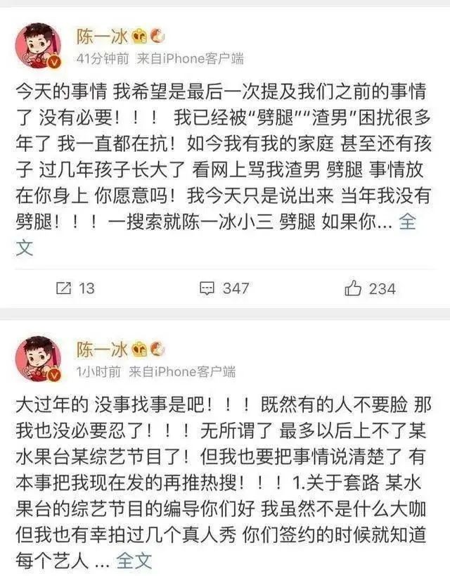这期节目播出之后,迅速窜上热搜,网友们纷纷对他的话表示质疑。在这之后,陈一冰发文解释自己这么长时间以来被冠以“渣男”的帽子,再三表明自己没有劈腿,还苦称自己给了何雯娜几十万的分手费,甚至还大骂了一番节目组。