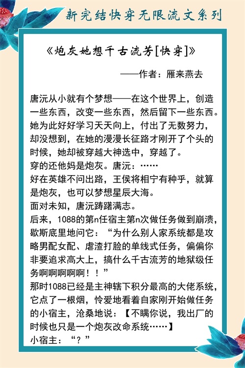 第三本:《炮灰她想千古流芳[快穿]》作者:雁来燕去