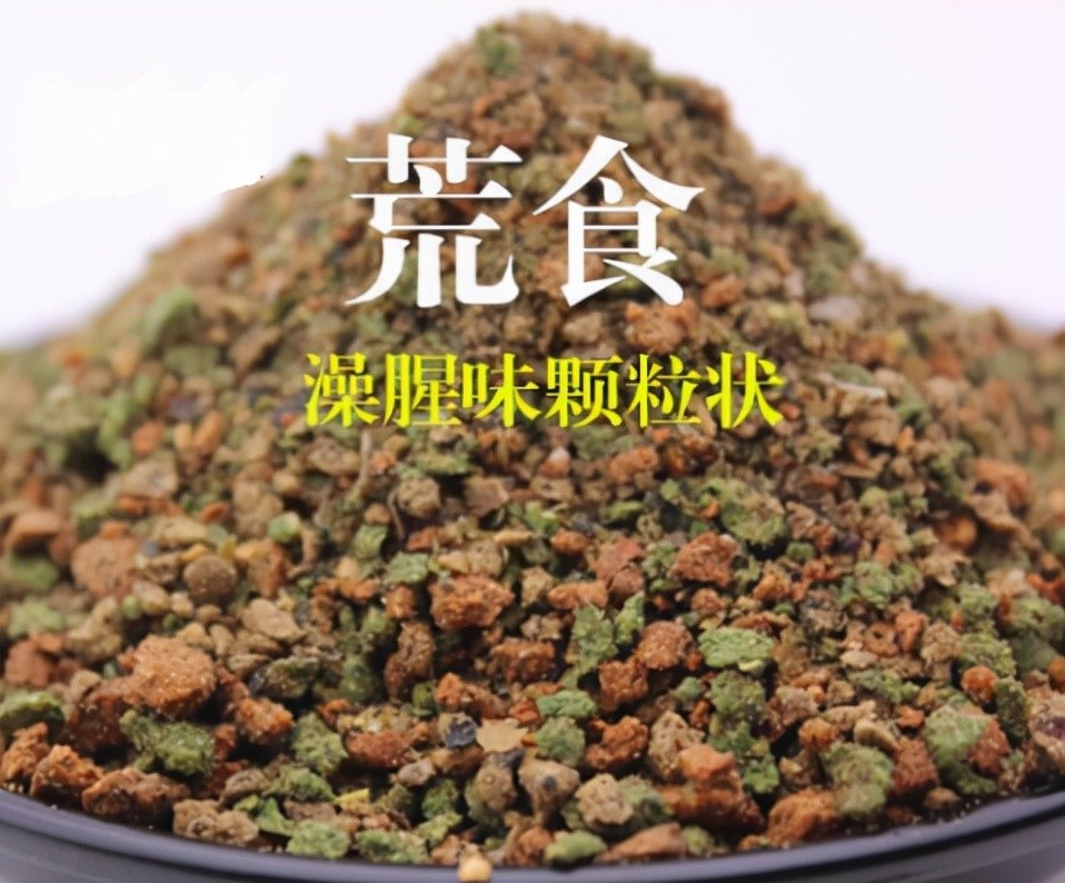 荒食饵料是由三种颗粒组成,深黄色的颗粒是鱼粉膨化大颗粒、深绿色的颗粒是海藻膨化大颗粒,褐色的小颗粒含有丰富的蛋白质,表现为浓腥味。