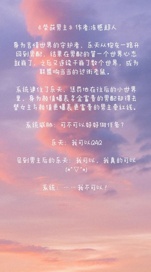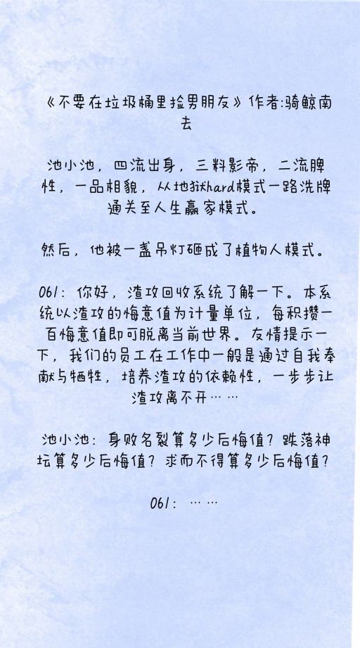 这个作者……emmm一言难尽,写得极好,算是我快穿文里白月光的存在了,但是她本人是个鸽子精!!!有时候一两个星期都看不到她的更新,看到的只是她请假条的更新,评论里有好多气到刷负的人。日更只是写给她自己看的,缘更才是她的归宿