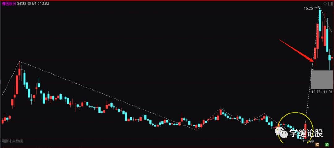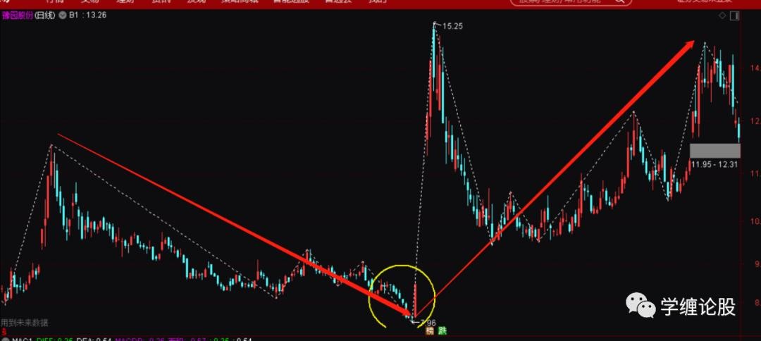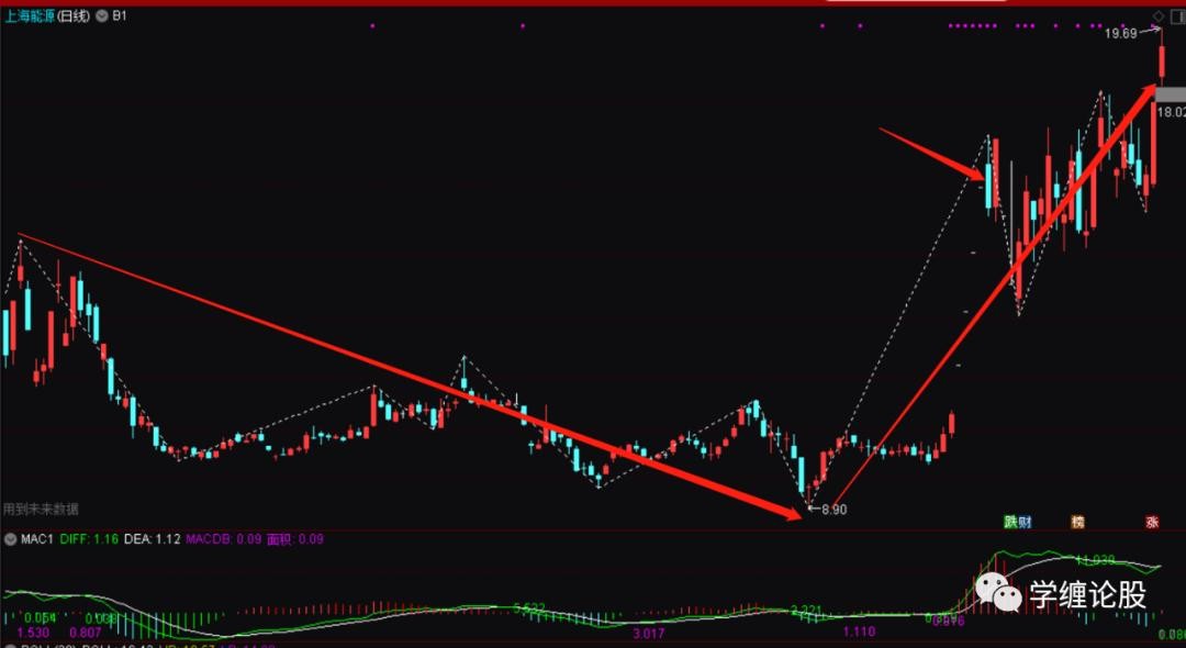 为什么说是初步有可能而不是确认呢?因为后面依旧可以砸下去跌破3.85去新低。所以这个时候也没有绝对的信心说就要走同级别反,而不是走前面走势的延伸。随着后面拉升的暴力起,直接涨停上破日线上6.18的高点,这个上破就非常的具有意义了,因为上破就宣告6.18到3.85走势的结束,后面一定是要走同级别的反(当然,特殊情况下依旧是可能通过小转大拉下来走延伸,这是一种极其罕见的事情,基本都是个股的基本面出现极其严重的问题了),同时也是上破周线最后一笔下的高点,并且走出了一个站上底分上沿强势的结构出来: