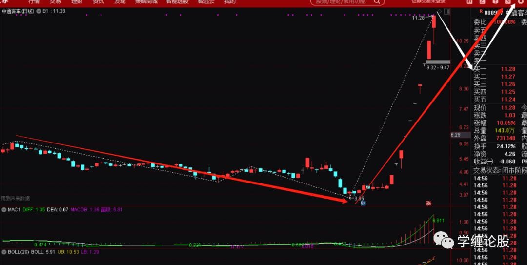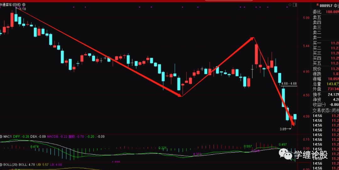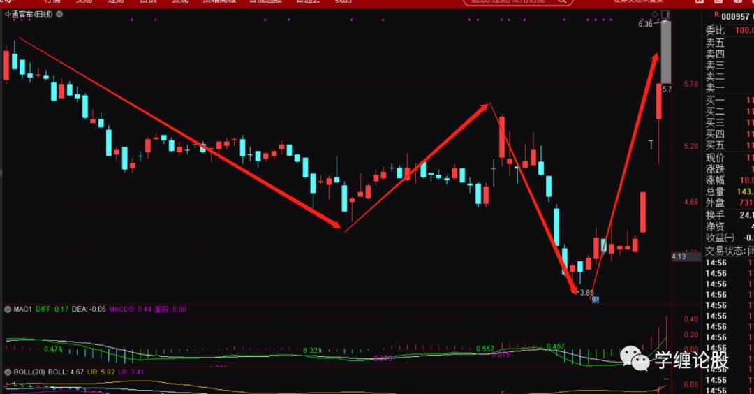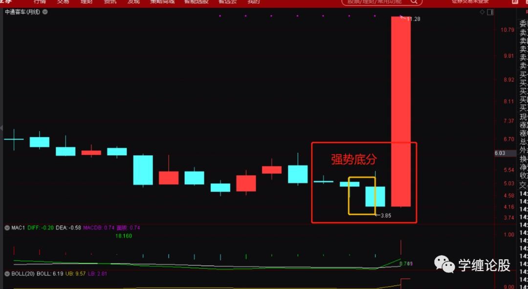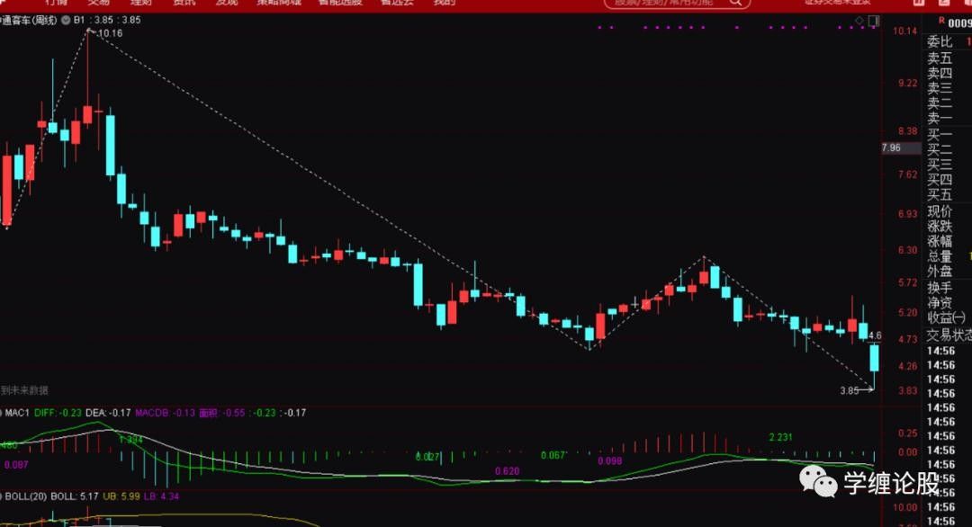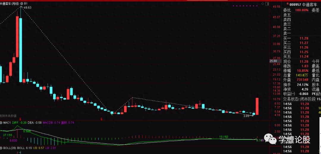 以上这些信息就给出了一个直接的信号:这个票一定要走同级别反。既然是走同级别反,那么3.85起来的走势这个时候才是一分级别的盘整上,跟前面6.18下来的级别还差很多,后面必然就是走级别的完美去,即一分递归到五分,五分递归到三十分,甚至最终走出月线上49下来到3.85的同级别反出来。得出结论后利用大级别的月线、周线的盘背、强势底分型的运用等知识就可以从容的打板追涨进去了,因为你下方才走出一个一分的中枢,而现在的涨停一字板是这个一分中枢的离开段,肯定是预期走趋势了,趋势走完就预期涨停打开慢慢震荡走一分下,一分上,从而构成五分盘整上,然后就是五分下,五分上……当然了,上破6.18之后也完全可以跌停的砸下去震荡走级别的完美,也就是说打板追涨完全可能被套,是的,没错,这个时候就要看操作者的经验能力了,即当下大盘环境是不差的,起码没有单边的下,再者,整个汽车板块已经算是本月的强势板块了,自然会走出几个强势龙头个股来,中通这种大级别结构完美,加之涨停强势拉起的自然就是候选龙头票之一。