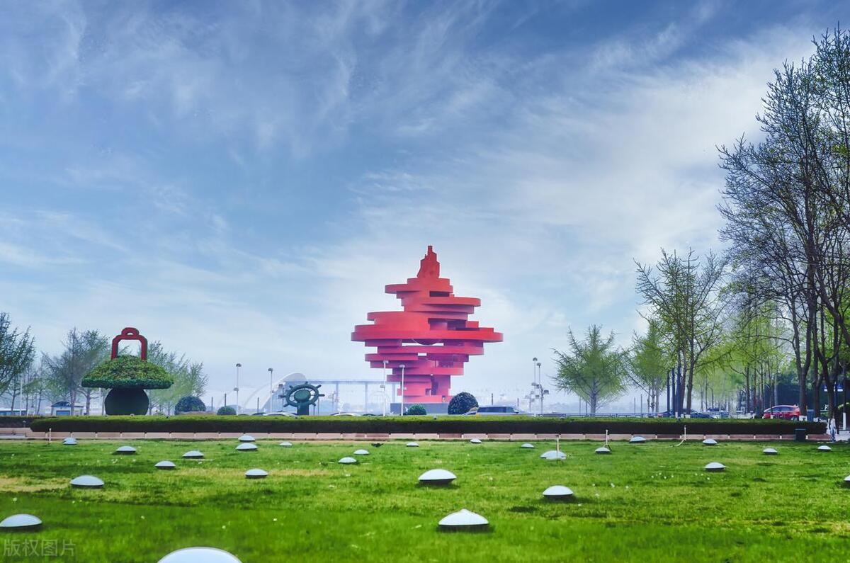 五四广场因五四运动而得名,以东海路为界分为南北两区:北区以绿荫大道间的草坪为主,中央建有喷泉;南区由露天舞台、点阵喷泉、观海迎月台和雕塑“五月的风“等组成,总占地面积达10万平方米,为青岛市地标建筑之一。