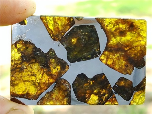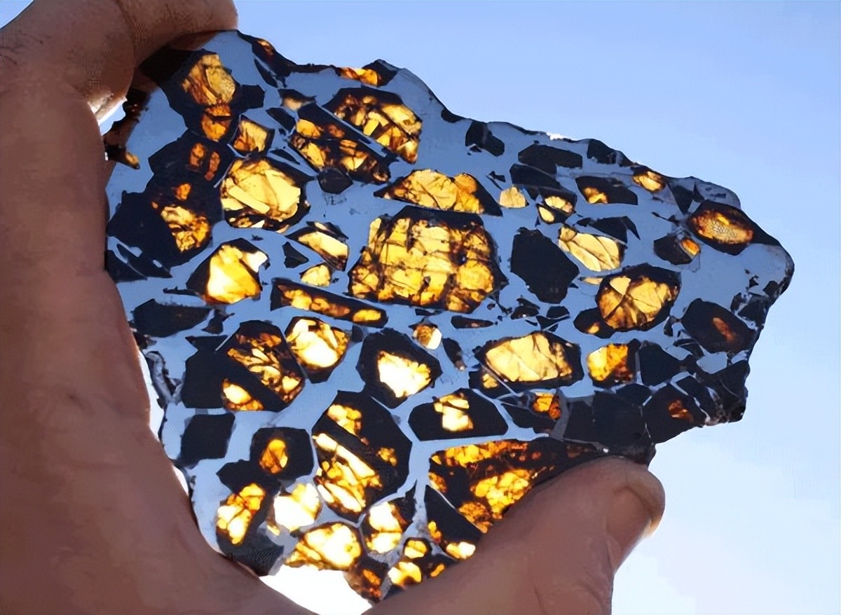 它独特的结构,是由镍铁元素组成的白色石面,金黄色的晶体则是镶嵌在其中的大块绿色橄榄石,每一块都是宝石级别。