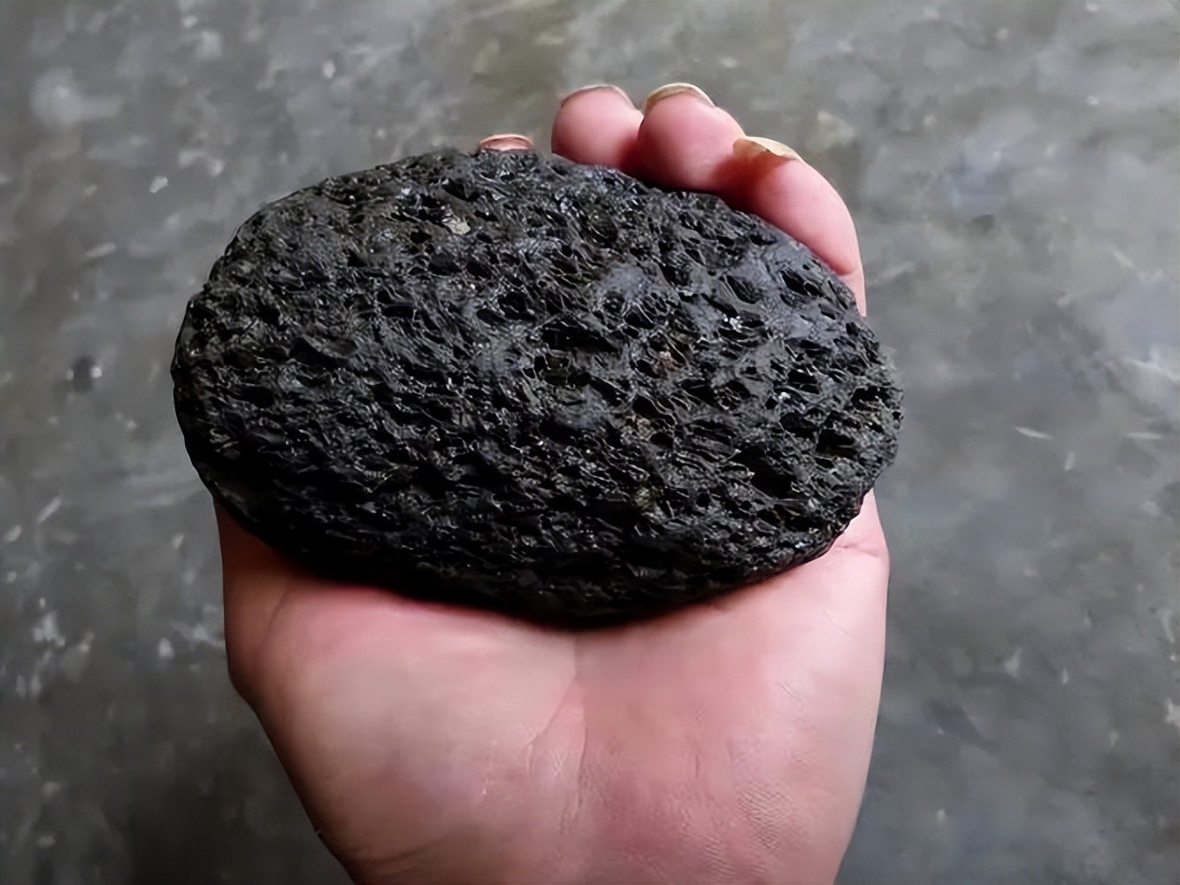 刚掉落下来的陨石,与地球岩石截然不同,不论形状、质地、颜色、比重、光泽都比较凸出。