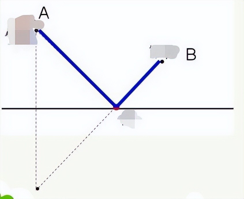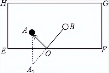 上面讲到的那个对称性的知识还可以用在打台球上。比如你的白球放在A点,而你要击中的目标球在B处,你要将白球击中边框后再击中目标球,那么应该击打那条边框的哪个点呢?就是下面这张示范图!当然,台球里的数学、物理知识非常多,和击打角度、力度等都有关系,这儿仅仅讲简单一例。