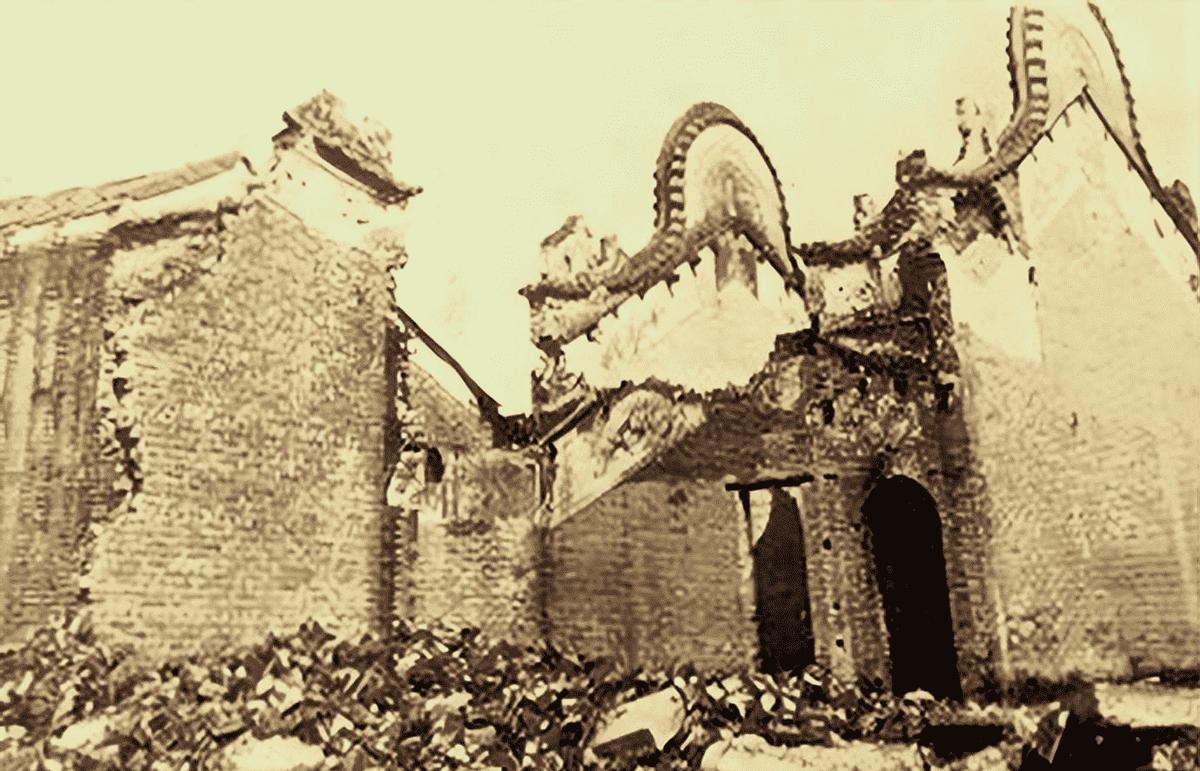 日寇攻陷广州后被毁坏的残垣断壁的古建筑景象。