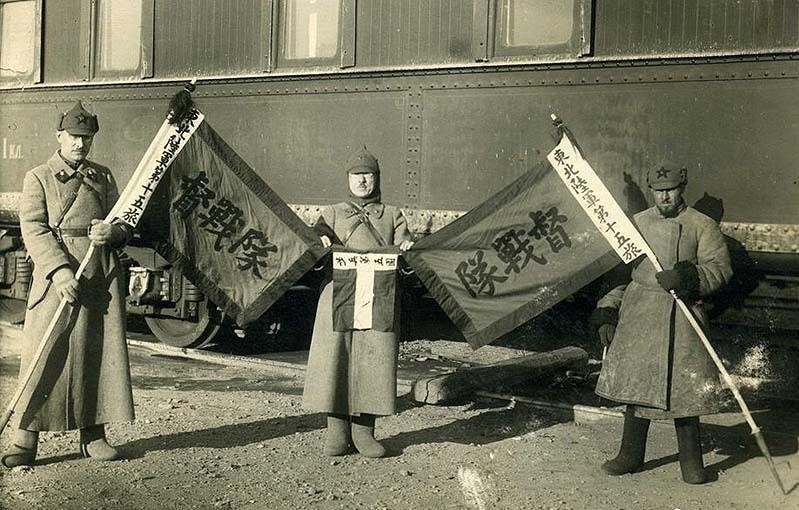 1929年,张学良与苏军发生中东路事件中,苏军展示缴获的张学良的“督战队”旗帜。