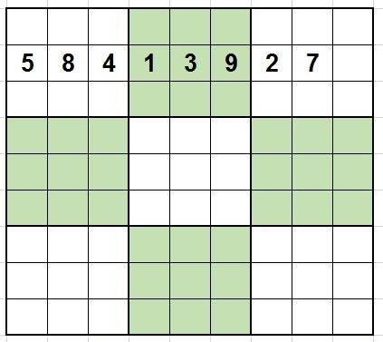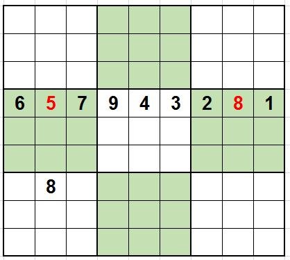 行隐性唯一数法:当某行中只有两个空格时,由于其他七个数字都出现了,因此这两个空格的数字就只能是两个数字中的一个,这时去观察和这两个空格相关的列和宫,如果列和宫里有这两个数字中的一个,则可以确定这两个空格中的数字。如下图: