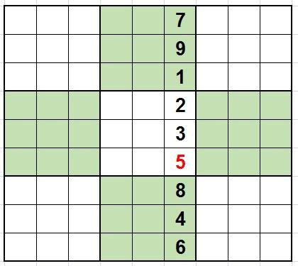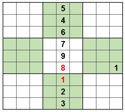 列隐性唯一数法:当某列中只有两个空格时,由于其他七个数字都出现了,因此这两个空格的数字就只能是两个数字中的一个,这时去观察和这两个空格相关的行和宫,如果行和宫里有这两个数字中的一个,则可以确定这两个空格中的数字。如下图:
