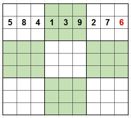 第二行中只有第九列一个空格,其他数字出现了5、8、4、1、3、9、2、7,因此空格中只能填6。