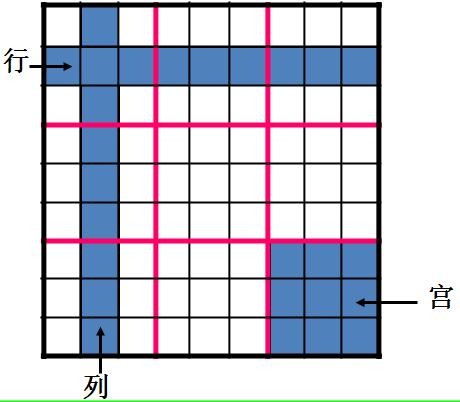 先认识一下九宫数独,如下图,就是一个空白的九宫数独,分为九行九列九宫,为了方便交流,我们从上到下称为第一行、第二行、第三行、……、第九行,从左到右成为第一列、第二列、第三列、……、地九列,将宫从左到右从上到下依次称为第一宫、第二宫、……、第九宫。