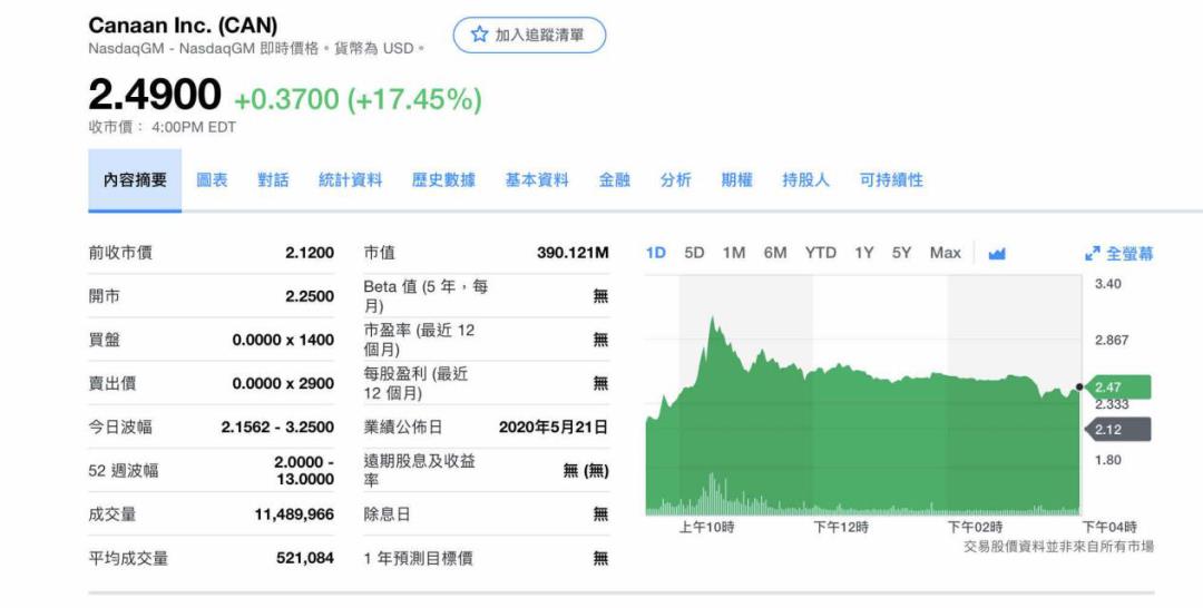 继6月1日嘉楠科技($CAN)触底2美元/股后,$CAN价格有所回升,据雅虎数据显示,6月2日,$CAN最高价为3.24美元,收盘价为2.49美元,涨幅为17.45%。
