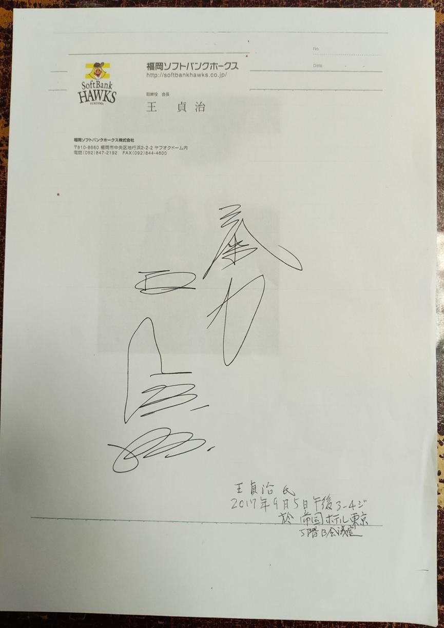 9月5日,他带上了关东大地震受害者遗属周江法和黄爱盛等人,在五楼B会议室。几个人进行了一个小时的交流,属于历史性的会见。两个人还在一起拍了照,王贞治用特有的福冈软银鹰株式会社,福冈软银鹰信纸为林伯耀签名留念。两个人拉家常一样地聊着,得知他是个孝子。