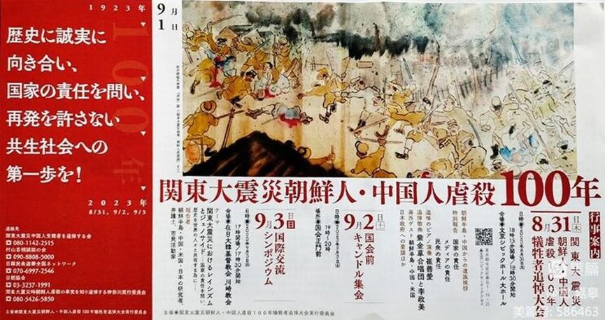 2023年8月31日,中国温州、青田被屠杀者遗属和日本市民,在东京文京区政府礼堂参加了追悼会。2000多名日本市民从四面八方赶到会场,大会为被屠杀的中国人、朝鲜人默哀三分钟。