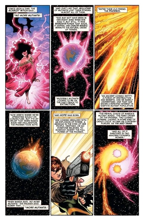 绯红女巫的原始混沌之力,与凤凰之力被认为是如阴与阳两股相对等的宇宙力量。当绯红女巫说「再无变种人!」,就这样,数百万的变种人因此丧失他们的能力;凤凰则说「管他的,更多变种人!」,变种人弥赛亚Hope因此诞生。